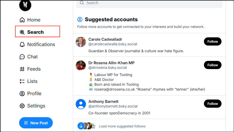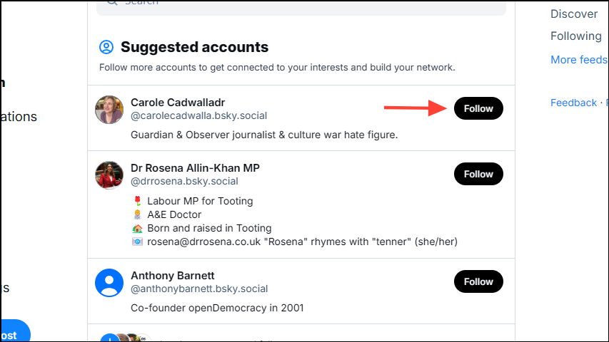 - The platform will suggest accounts that you can follow. To do so, click on the 'Follow' button next to the username/Bluesky handle you want to follow.