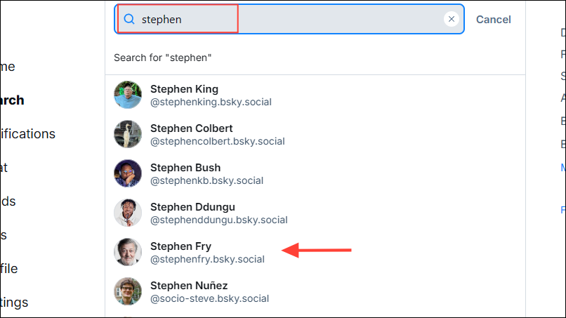 - Then type the name of the user you are searching for in the search box at the top. Bluesky will show you the relevant results and you can click on the username you want to follow.