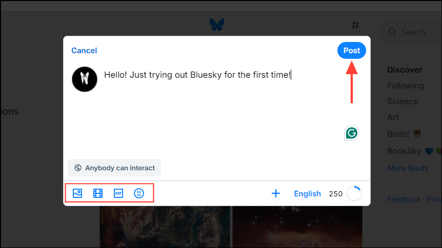 - Once you complete the sign-up process, Bluesky will take you to your 'Discover' page, which will show posts based on your interests. You can scroll through the feed and comment, repost, or like the posts using the buttons below them.