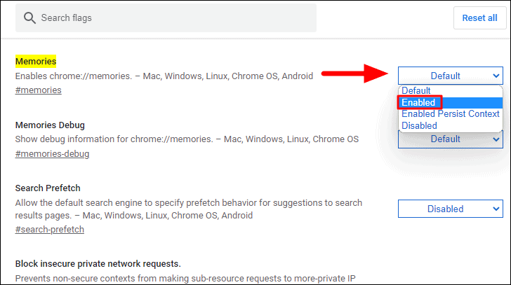 You will now find the Memories flag listed at the top. Click on the drop-down menu next to it, and select ‘Enabled’ from the list of options.