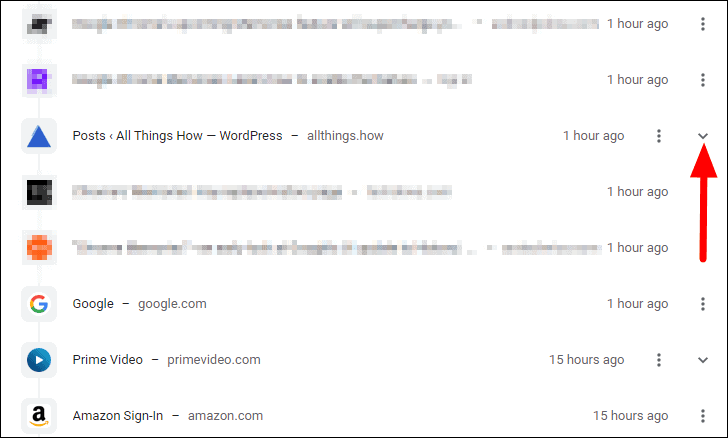 Multiple pages accessed on the same website will be collapsed under a single entry. To view them all, click on the carrot arrow icon next to the entry.