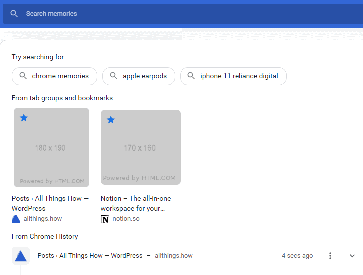 Chrome Memories, currently under testing, has been made available to users. It works much like the history feature, sporting a similar interface as well. However, it categorizes the web pages you have visited, lists some recommended searches, and also offers a card-based view of the browsing history.