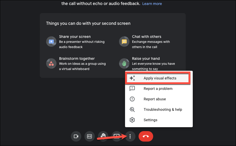When you’re sharing your video, you can also use visual effects by clicking the three-dot menu and selecting ‘Apply Visual Effects’ from the menu. Then, select the effect from the panel that opens.