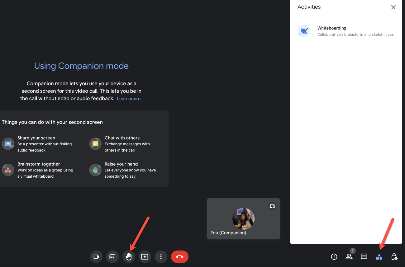 - If you’re in a conference room and meeting with remote users using Google Nest Hub Max or other meeting hardware, use Companion Mode to get the same interactive tools and controls as the remote participants.