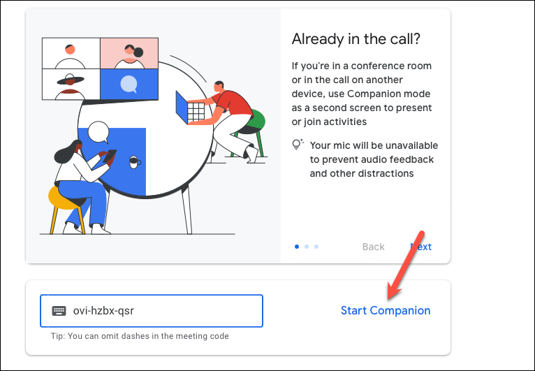 When you have a meeting code, you don’t have to go to meet.google.com, enter the code, and then join the meeting in Companion Mode from the meeting landing page. Instead, navigate directly to g.co/companion. Then, enter the meeting code in the textbox provided and click ‘Start Companion’. And you’ll join the meeting in Companion mode.