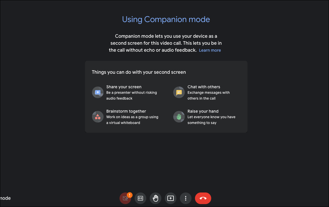 Not all Google Meet features are available in Companion Mode. You get access to the following features in this mode: