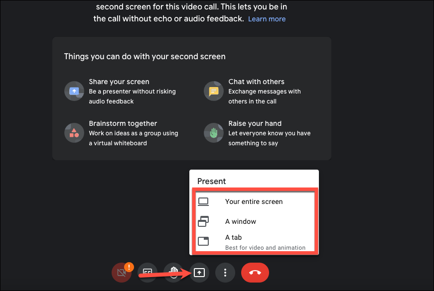 Then, select what would you like to present – Your entire screen, A window, or A tab – as you would in the normal meeting mode.