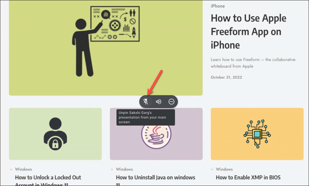 If you’re viewing a presentation, you don’t need to do anything on your companion mode screen. But on your primary device with the normal meeting, click the ‘Unpin’ button on the presentation so you can see video tiles instead.