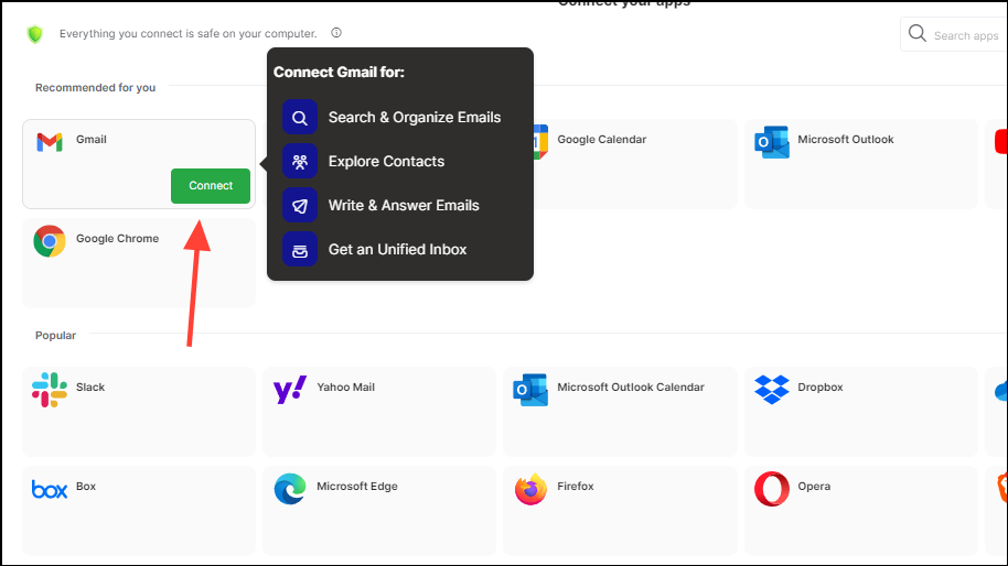 - On the next page, you can connect your apps with Curiosity AI. Click on the 'Connect' button for the app you want to connect and you will see a few options. For instance, you can connect your Gmail to search through and organize your emails right from your computer.