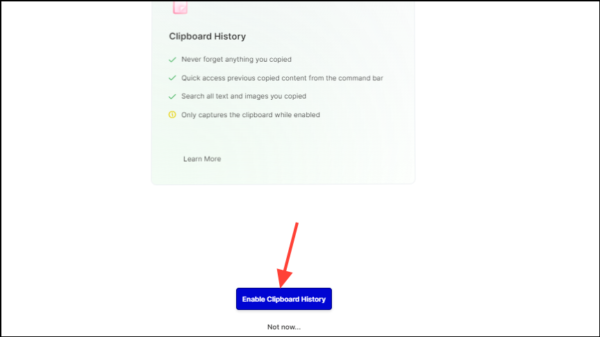 - Next, you need to enable Clipboard History, so Curiosity AI can store information that you copy and make it accessible whenever and wherever you need it. Click on the 'Enable Clipboard History' button.