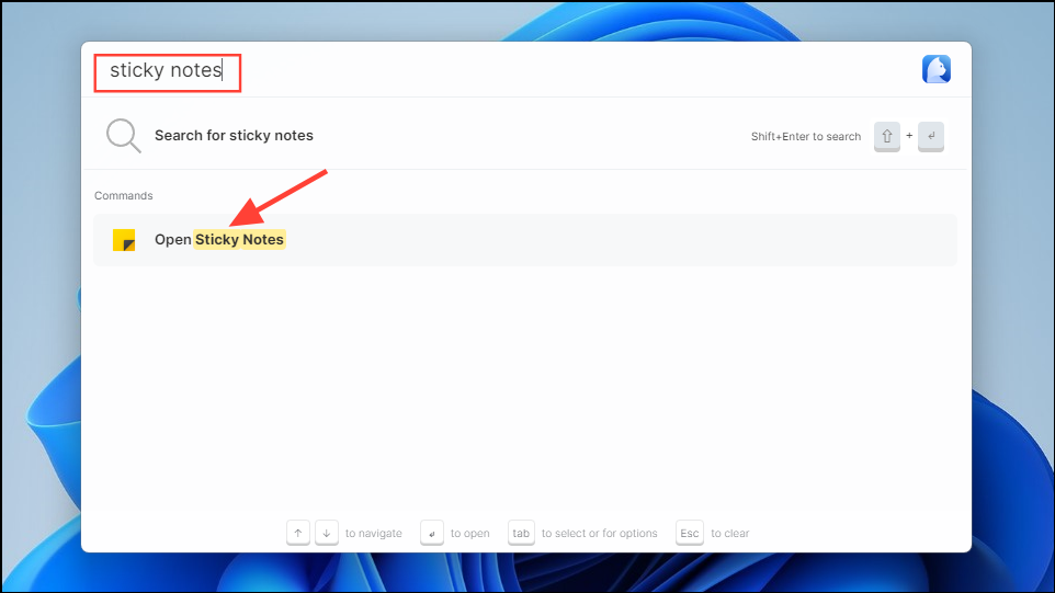 sticky notesin the box and the app will show up in the results. You can simply click on it or press the 'Enter' key to launch it.