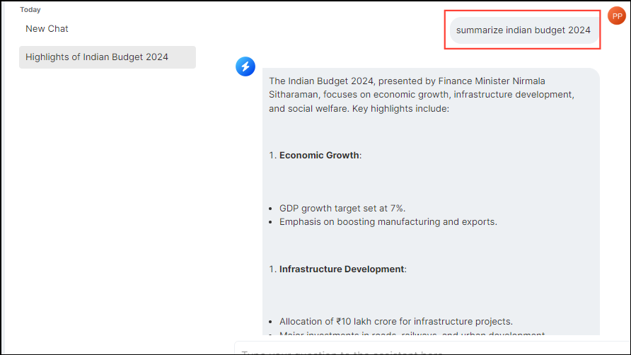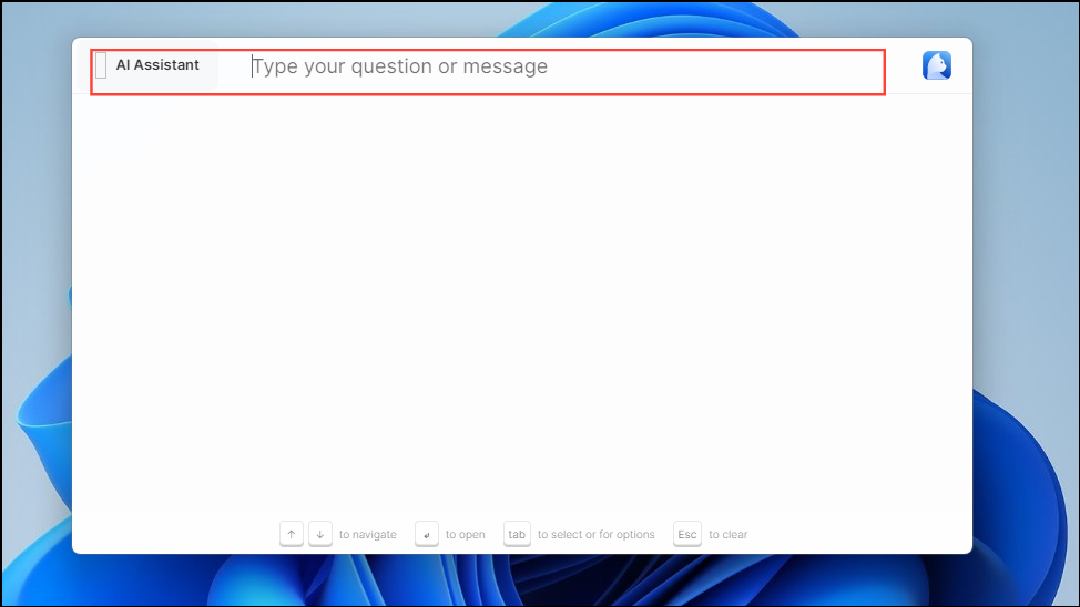 - Type in your query or request and press the 'Enter' key to interact with the AI assistant. You can use the assistant to generate code, text, summaries, reply to conversations, search through files, and more.
