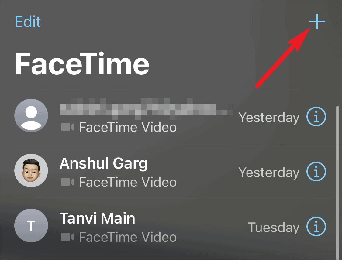 You can make a FaceTime call from several places from your iPhone. Open the FaceTime app on your iPhone and tap the ‘+’ icon on the top-right corner of the screen.
