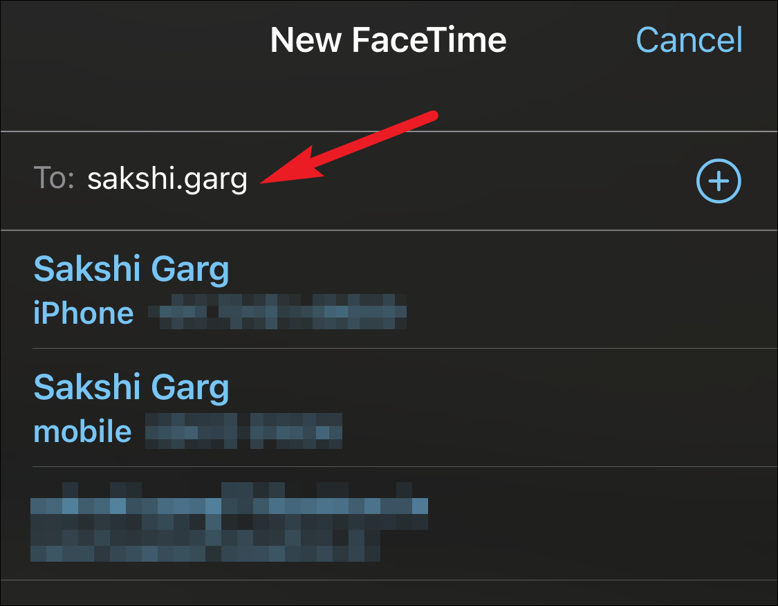 Then, search for the person’s contact or start typing their registered phone number or Apple ID in the ‘To’ textbox. The result will appear below the search box. If the number/ email address is registered with FaceTime, it’ll appear in blue color as opposed to the rest of the contacts that’ll be white. Tap on the contact to select it.