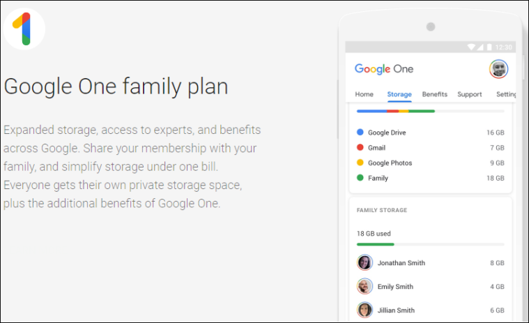 Google One sharing. Google Family Group also includes access to Google One family plan. All family members get access to their separate storage and other benefits of Google One.