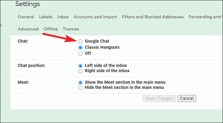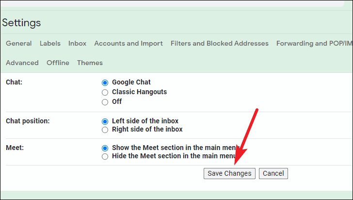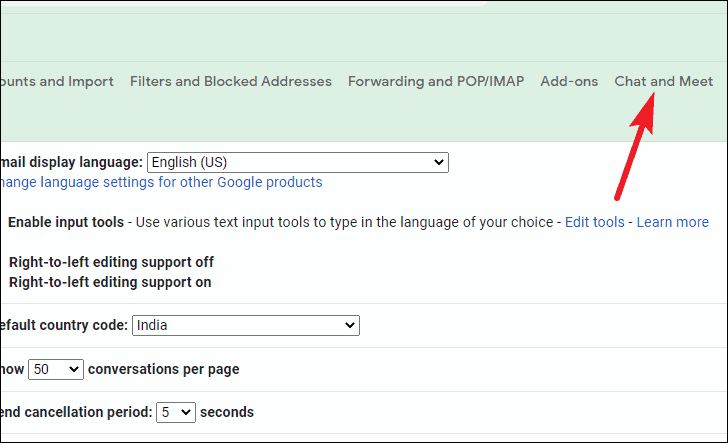 Then, select the ‘Chat and Meet’ tab from the setting options.