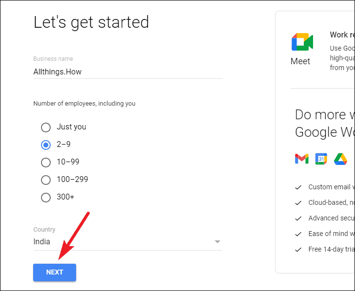 Enter your business name, number of employees, and your country and click ‘Next’.