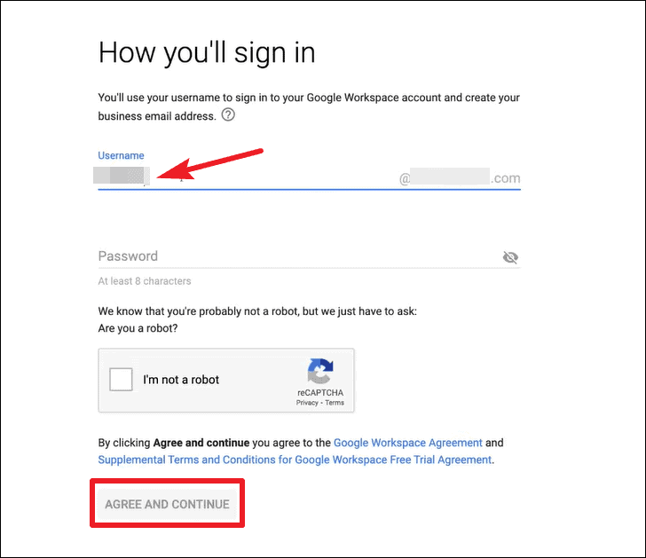 Then, you’ll need to create a username for your Google Workspace account. This would be the first business email address for your domain. You can create more business addresses for your team later on once you set up Google Workspace. Create a password and then click ‘Agree and continue’.