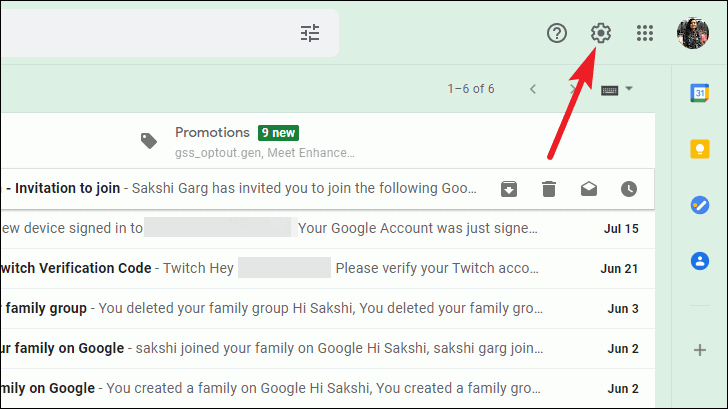 To enable the integrated experience Google Workspace offers for free accounts, go to your Gmail account and click the ‘Settings’ icon in the upper right corner.