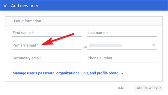 Enter the user’s information: their first and last name, then their primary email. Workspace would suggest a username for the primary email that would be different from all the existing emails in your domain; you can use that or enter one on your own.