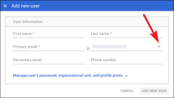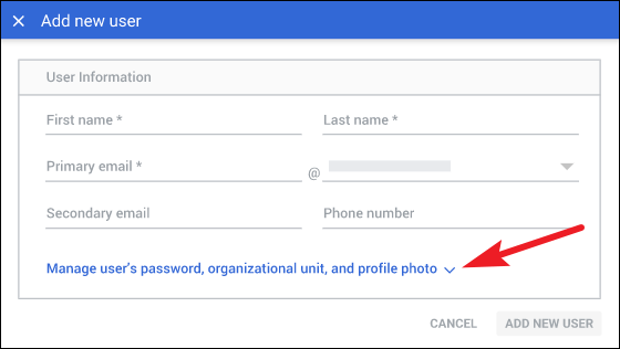 Then, click the arrow next to ‘Manage user’s password, organizational unit, and profile photo. Setting a profile photo or editing the organizational unit is optional.