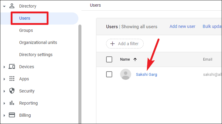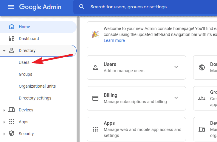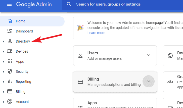 Go to your admin console and click the ‘Directory’ option from the navigation menu on the left.