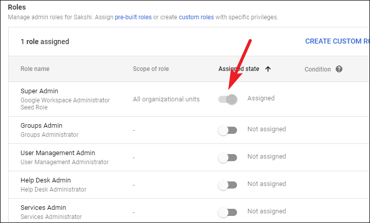 This will display toggles next to all the available pre-built roles. To make them super admin, enable the toggle next to it. To assign them a specific admin role, enable the toggle next to the desired role. You can also create custom roles if the pre-built roles aren’t up your alley.