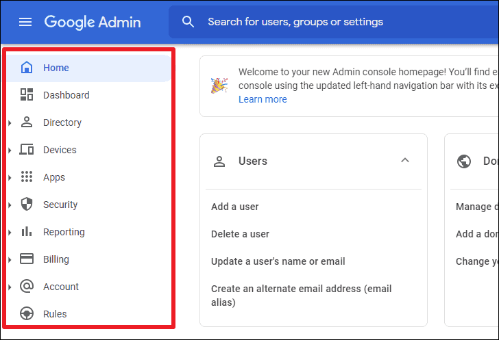 The admin console homepage will open. The collapsible navigation menu on the left allows you to browse through all the options for managing Google Workspace for your organization quickly.