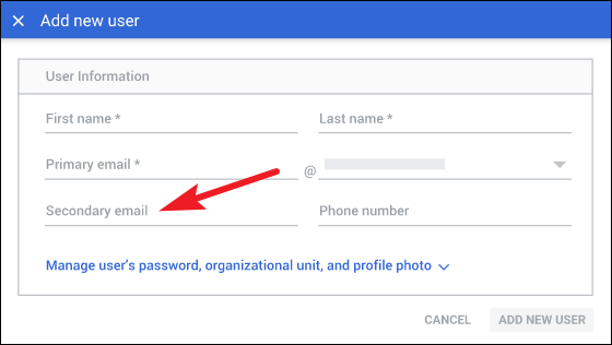 Then, enter the secondary email for the user. The secondary email can be their personal email where they’ll receive the account details. You can also enter your own email address to capture the login information and forward it to them later.