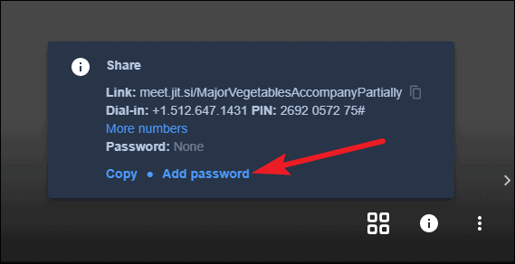 Step 4: To add a password to your meeting for added security, click on the 'i' icon at the bottom right corner of the screen.