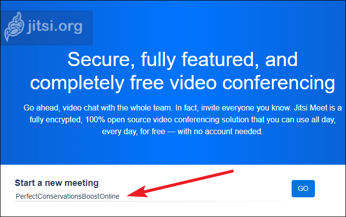 Step 2: Under the 'Start a new meeting' option, enter a unique name for your meeting room in the textbox and click on 'Go'. You can also select a suggested room name provided by Jitsi Meet.