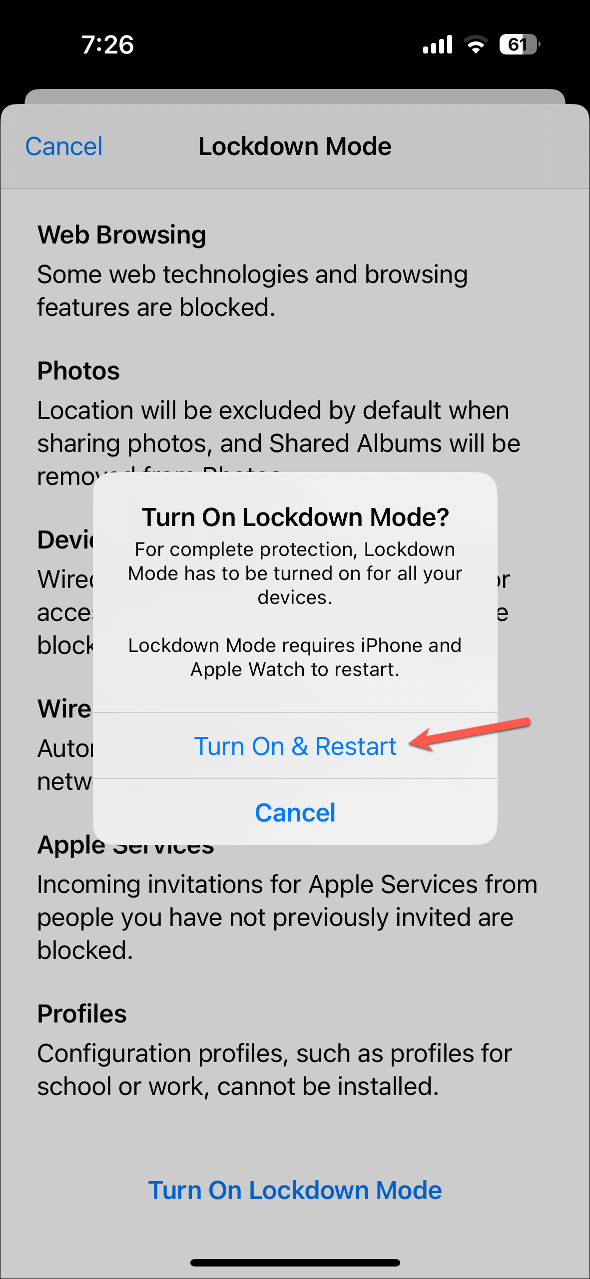 - Tap on 'Turn On Lockdown Mode' on the next screen.