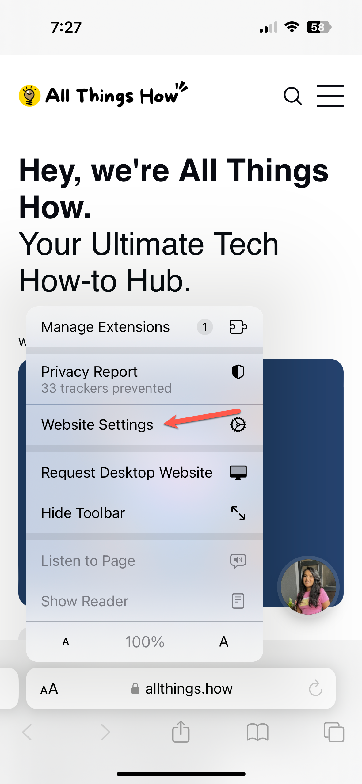 - Then, tap 'Website Settings' from the menu.