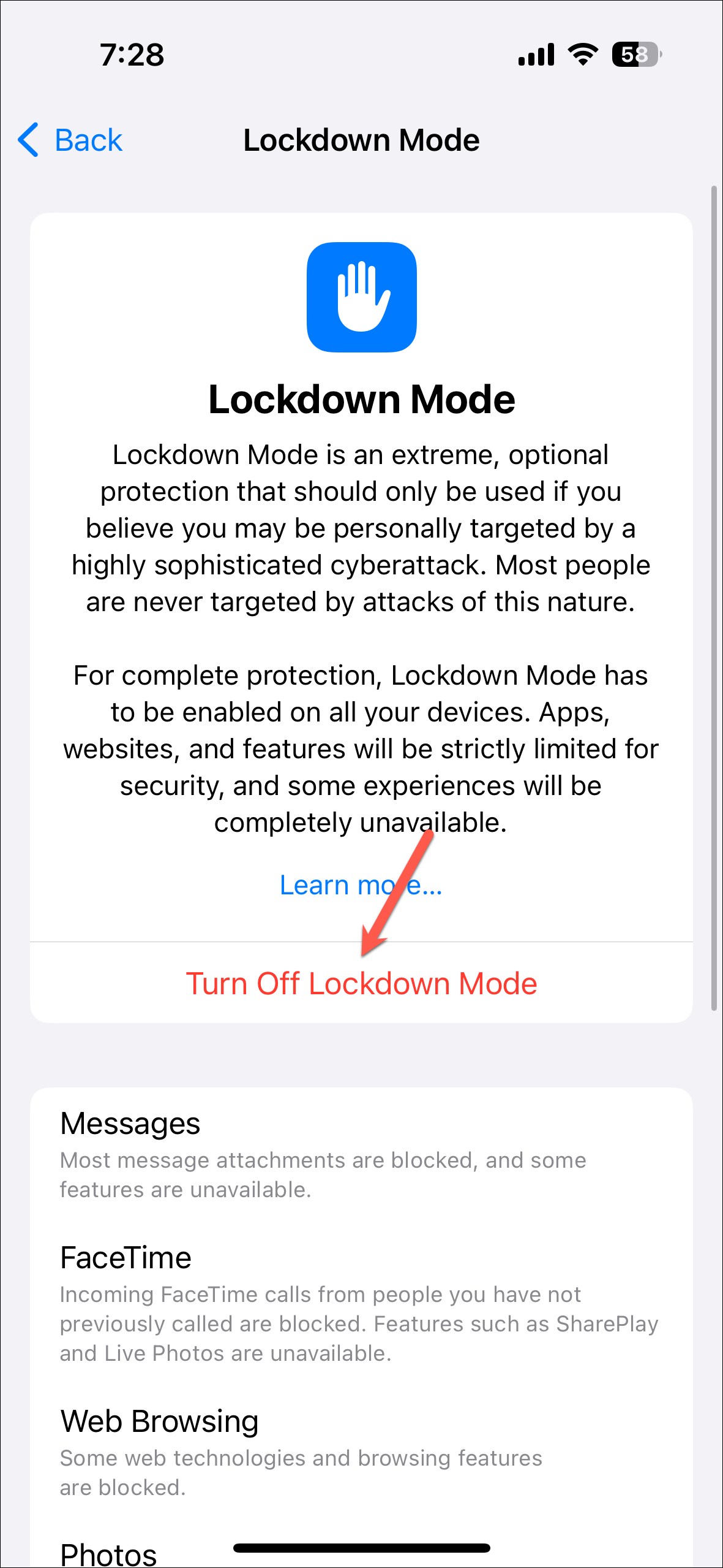 - Then, scroll down past the information about Lockdown Mode and tap on 'Turn on Lockdown Mode' again.