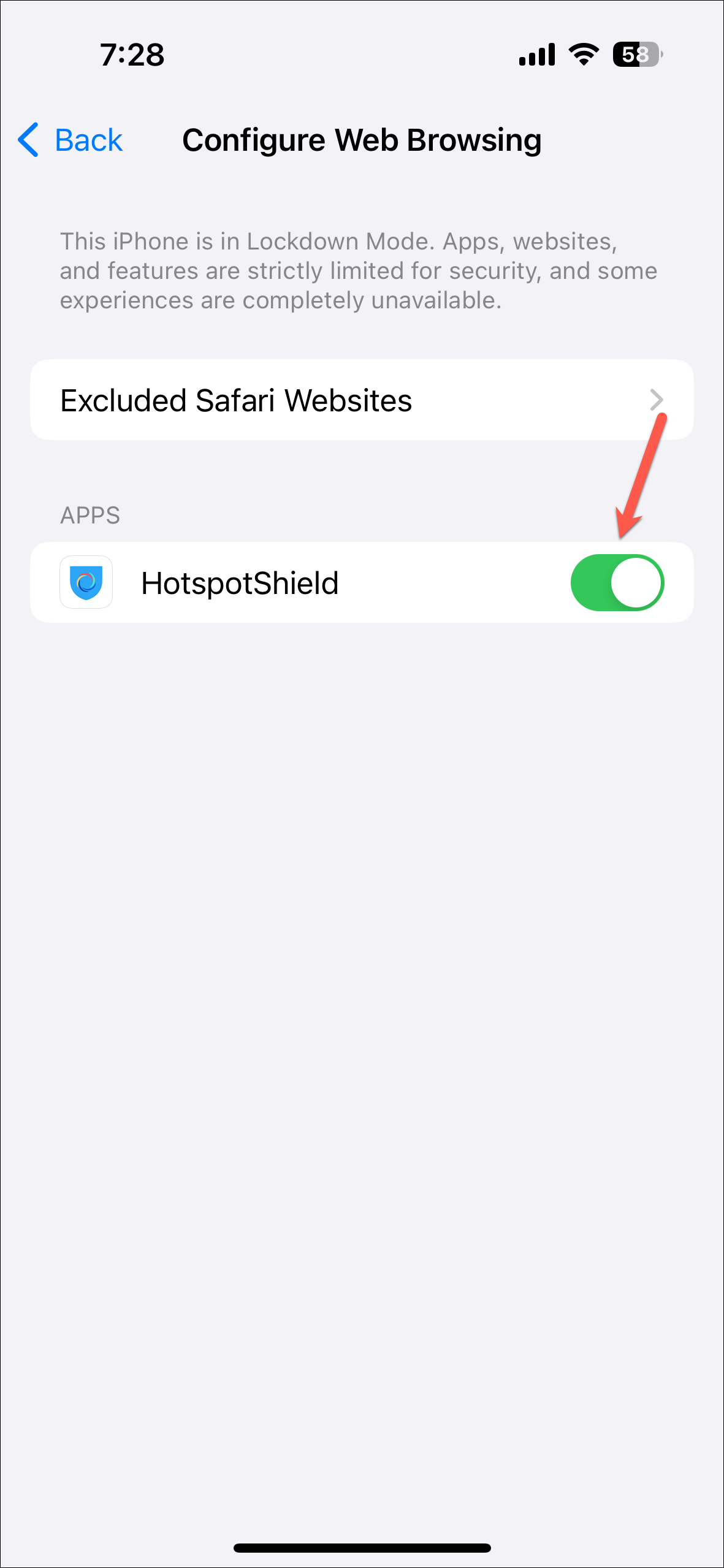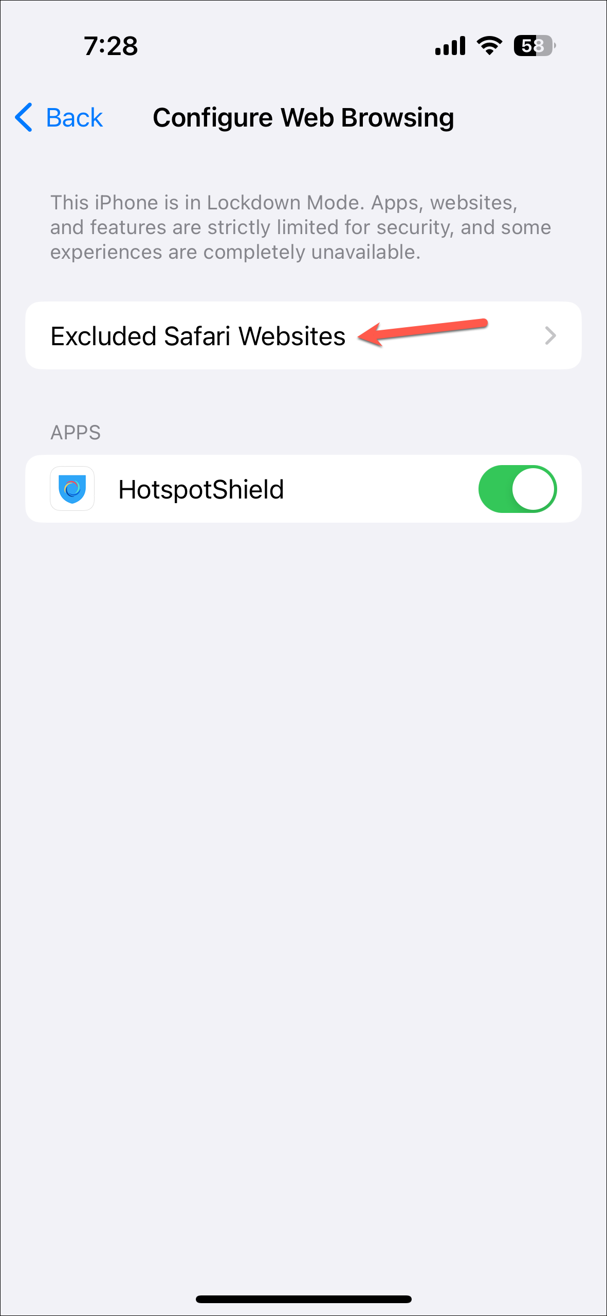 Settings>Privacy & Security>Lockdown Mode. - Then, scroll down and tap on 'Configure Web Browsing'.