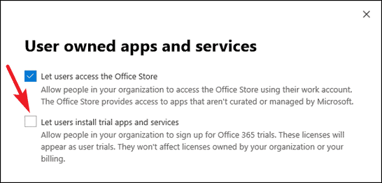 Then, select the checkbox for ‘Let users install trial apps and services’ and click on ‘Save changes’.