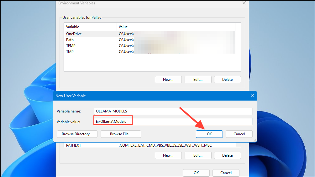 - Then type the location of the directory where you want Ollama to store its models in the 'Variable value' field. Then click on the 'OK' button before launching Ollama from the Start menu.