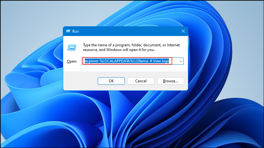 Win + Rshortcut to open the Run dialog and then typeexplorer %LOCALAPPDATA%\\Ollama # View logsinside it before pressing Enter.
