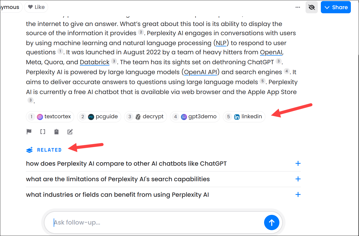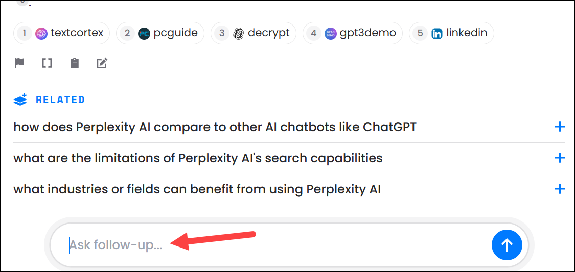 You can also ask follow-up questions on any topic for a deeper dive, and Perplexity will respond, keeping its earlier responses in context.