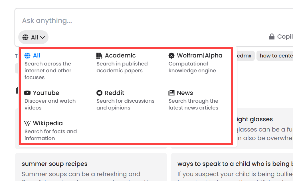 While it can search across the Internet for answers, you can also streamline its focus to different domains such as Wolfram|Alpha, Wikipedia, Reddit, YouTube, News articles, Academic Papers, etc.