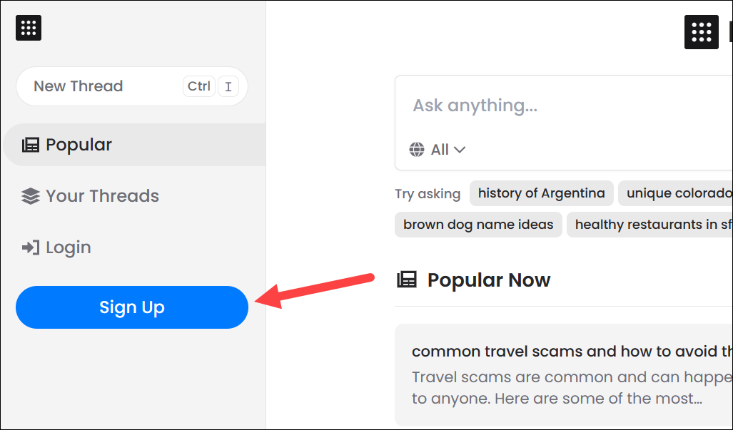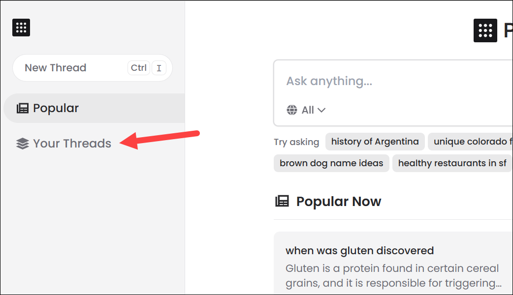 Start a new search on Perplexity by either clicking the 'New Thread' option on the left or going to the homepage.