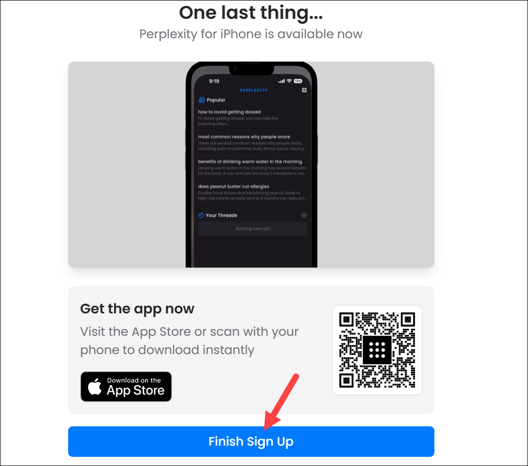 On the onboarding screen, you can either scan the QR code to install the iPhone app or click 'Finish Sign Up' to proceed.