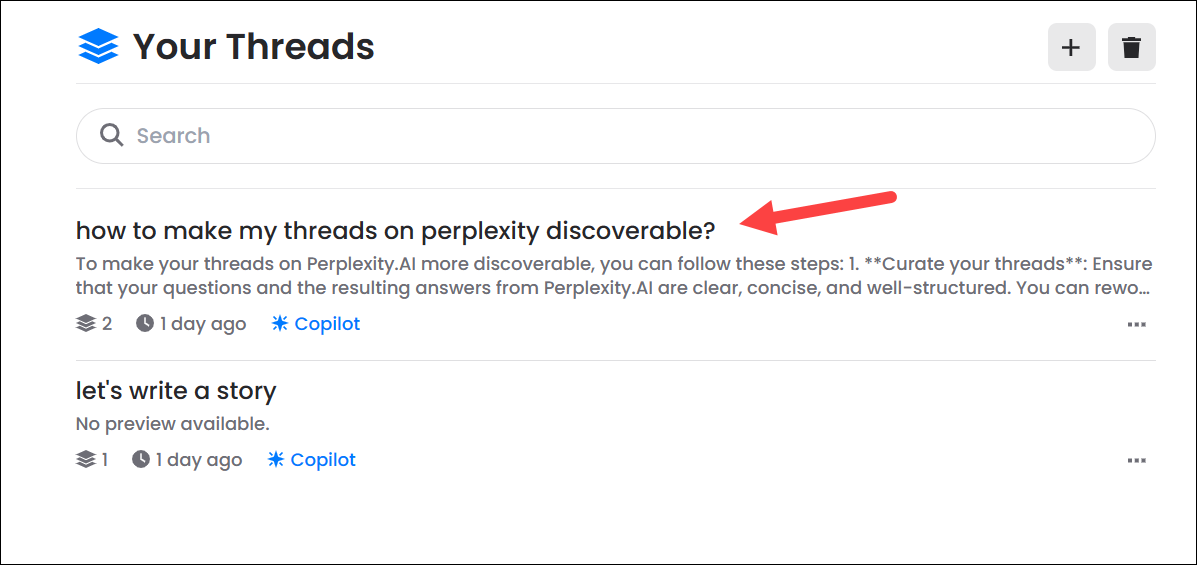 Perplexity AI can save your search threads (a single back-and-forth session with the AI) and even lets you share them with other users, as permalinks. You can also monitor stats, such as views, shares, and likes, for your threads. The feature is only available for users who create an account on the service. You can also manage your threads easily by deleting them.