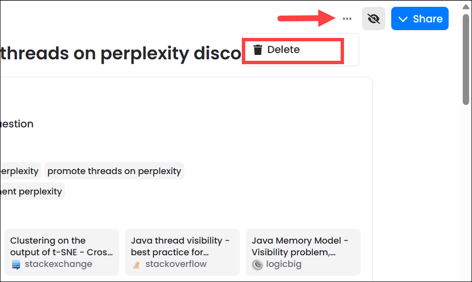 To delete a thread, click the 'three-dot menu' (...) and select 'Delete'. Currently, you cannot delete individual queries and their answers from a thread; you can only delete a complete thread.