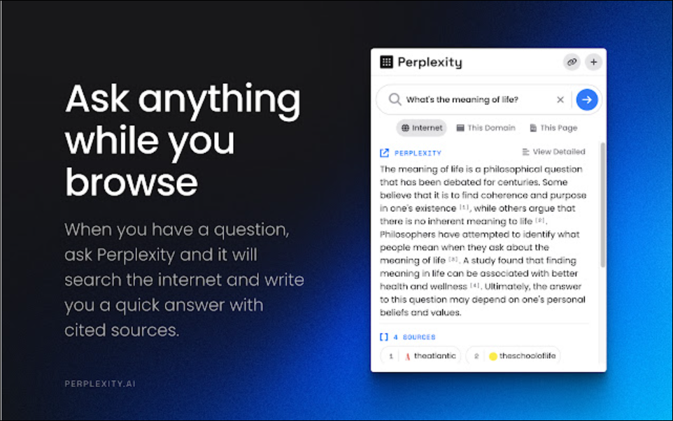 Perplexity - Ask AI is a Chrome extension that allows you to use Perplexity anywhere while browsing the Internet. So, anytime you need to search for anything you come across, Perplexity AI is just a click away.