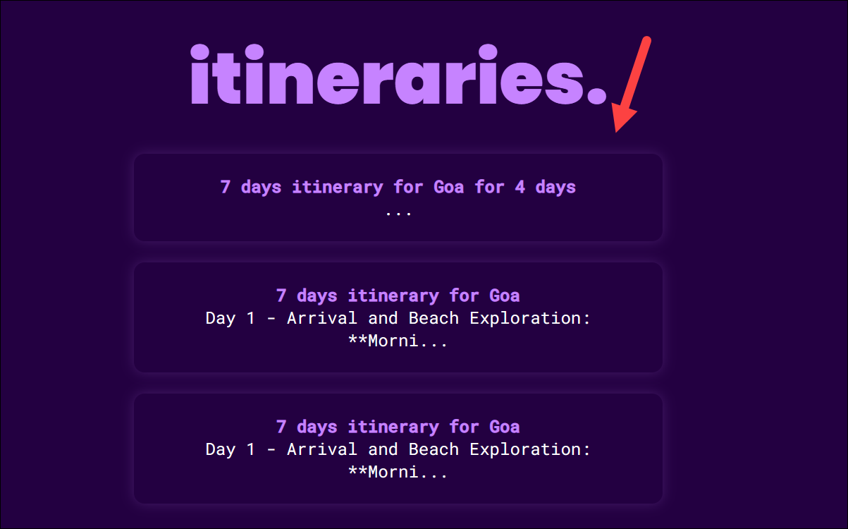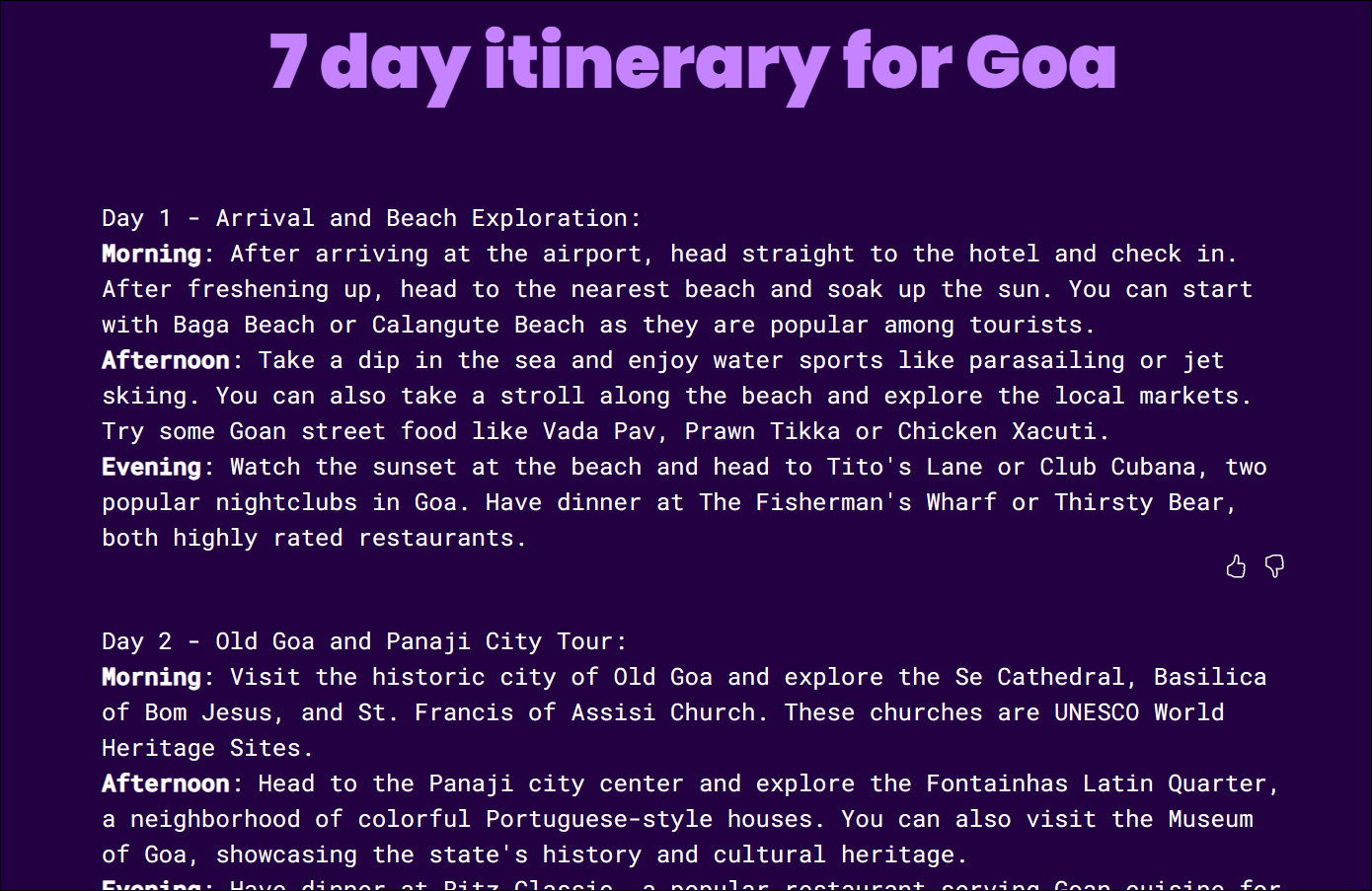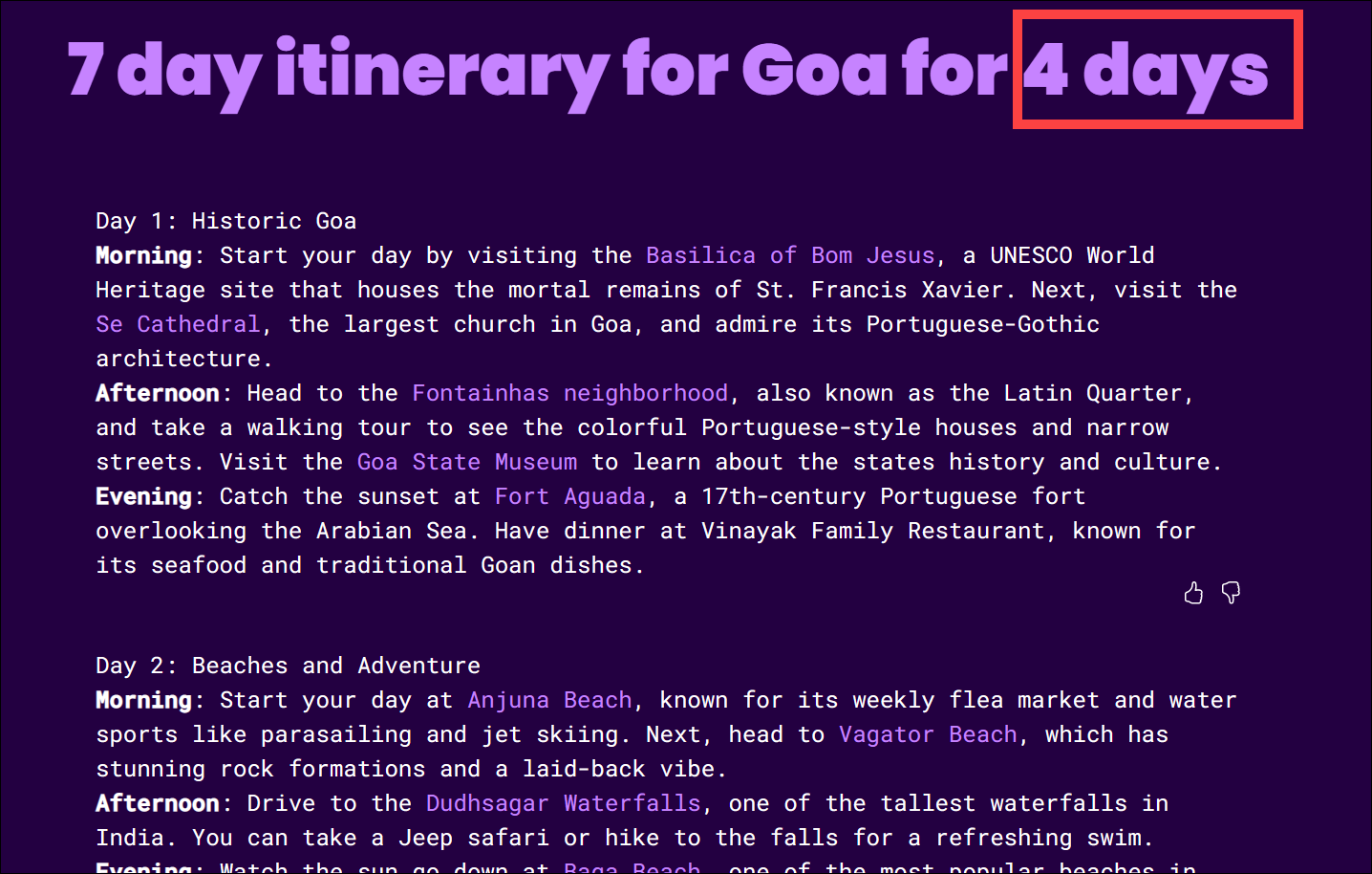 But while entering the destination, you can still ask it to make a smaller itinerary. For example, you can enter Goa for 4 days , and instead of 7 days, it'll only generate a plan for four days even if the interface says stuff like 7 day itinerary for Goa for 4 days. It can't generate a plan for more than seven days, though. Also, entering any additional details in the first request itself will cause it to fail. Â