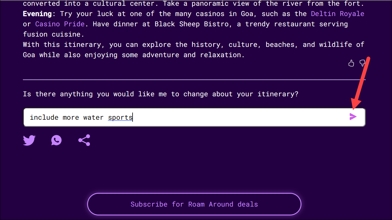 For example, you can ask it to make the itinerary family-friendly or pet friendly. You can ask for only vegan restaurant recommendations or tell it about the activities you enjoy and what kind of food you like to eat and ask it to modify the plan keeping these in mind. Enter your request in the text field under the complete plan and click the 'Send' button. You can keep sending requests for a more tailored itinerary until you are satisfied.
