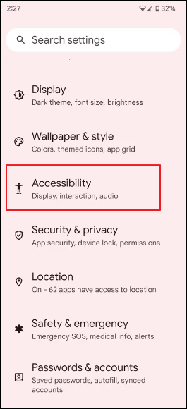 - Open the Settings app and then tap on the 'Accessibility' option.