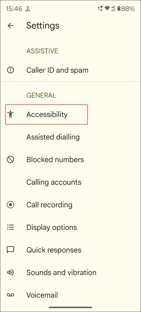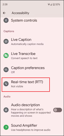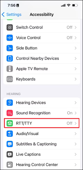 - On the Accessibility page, look for the Real-Time Text (RTT) option. If it is present, tap on it.