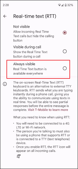 - Tap on the 'Always Visible' option. Now, you are ready to make RTT calls.